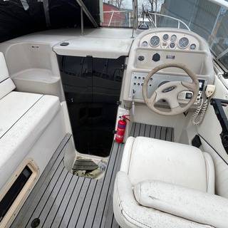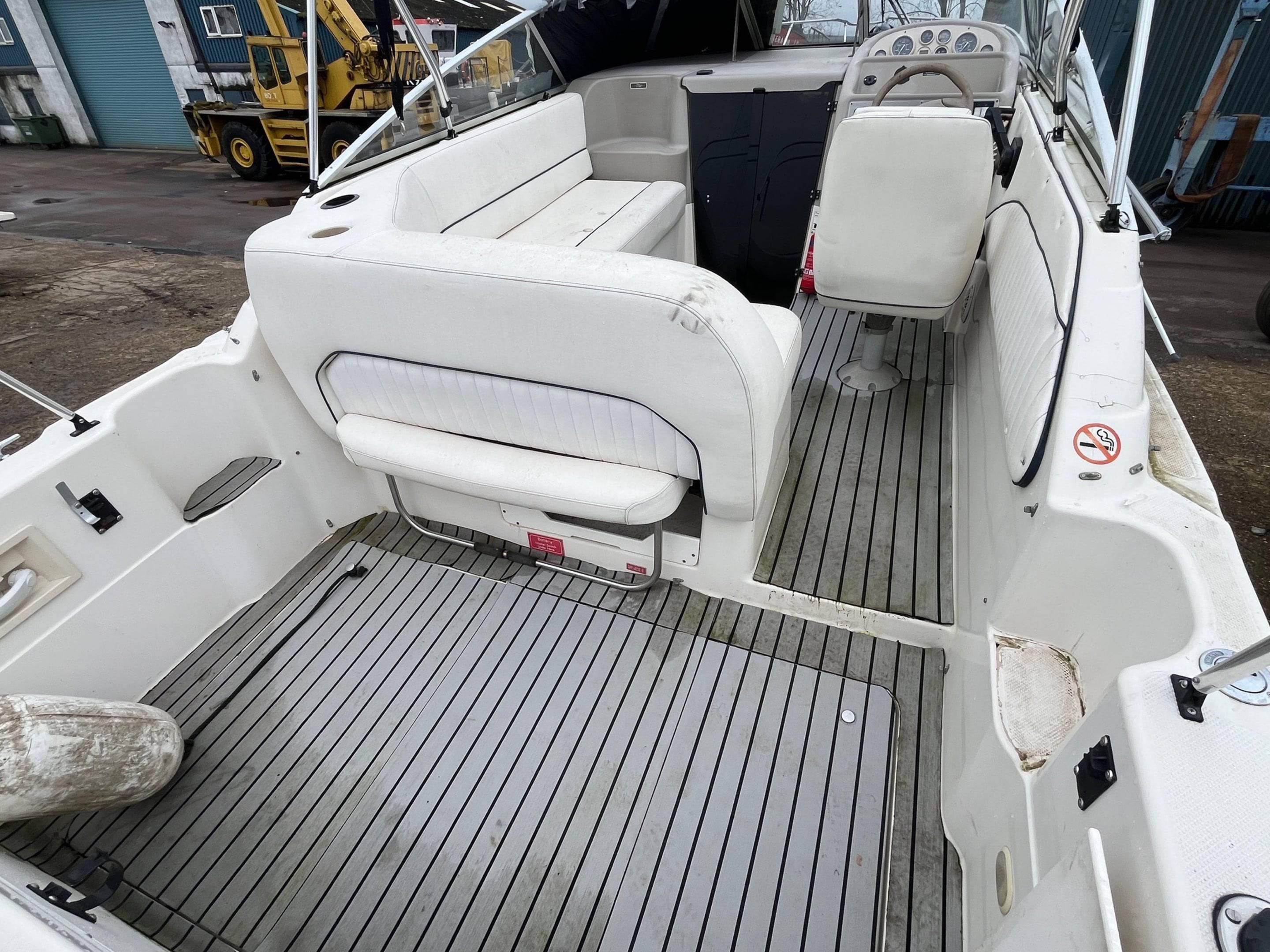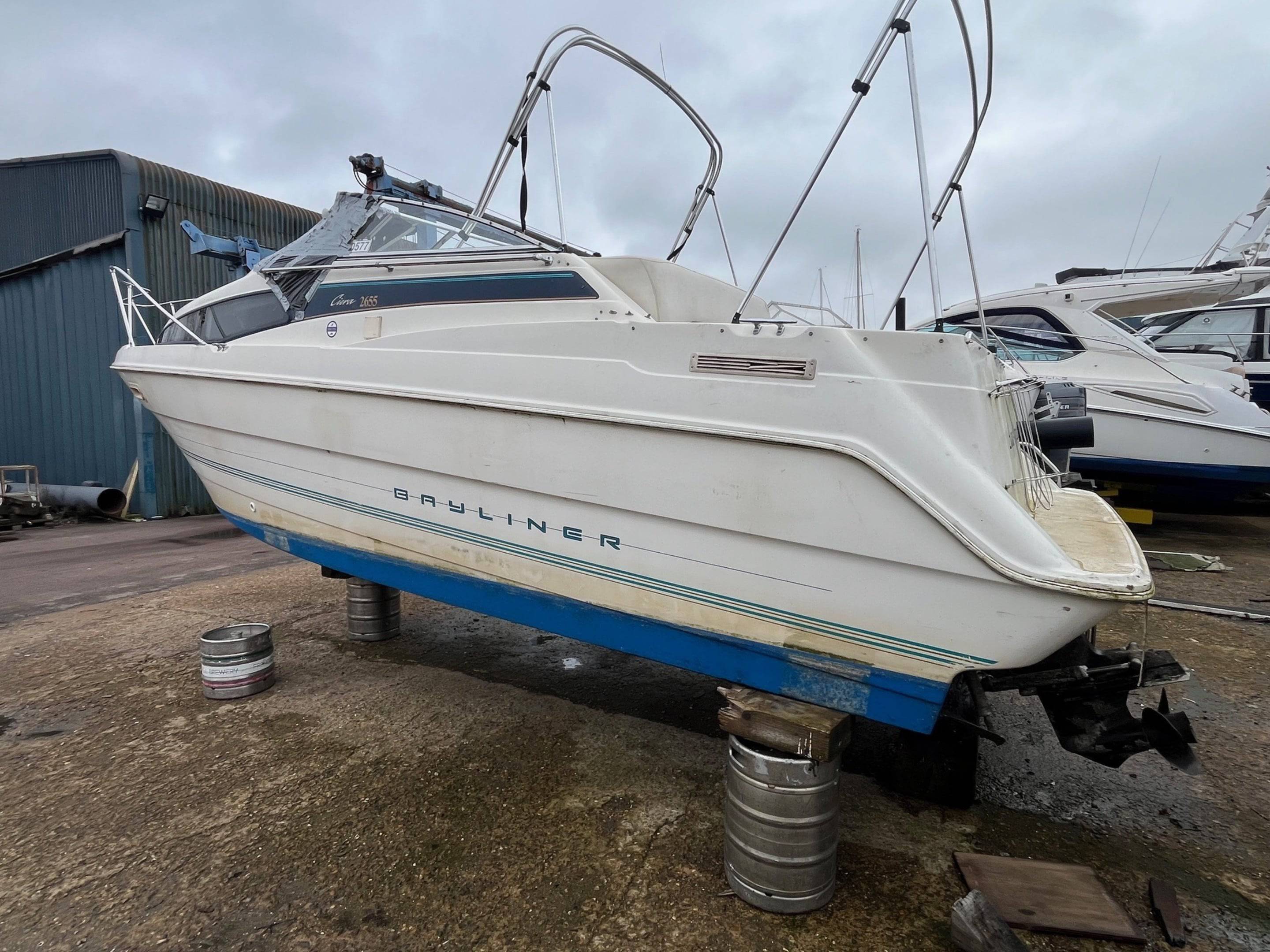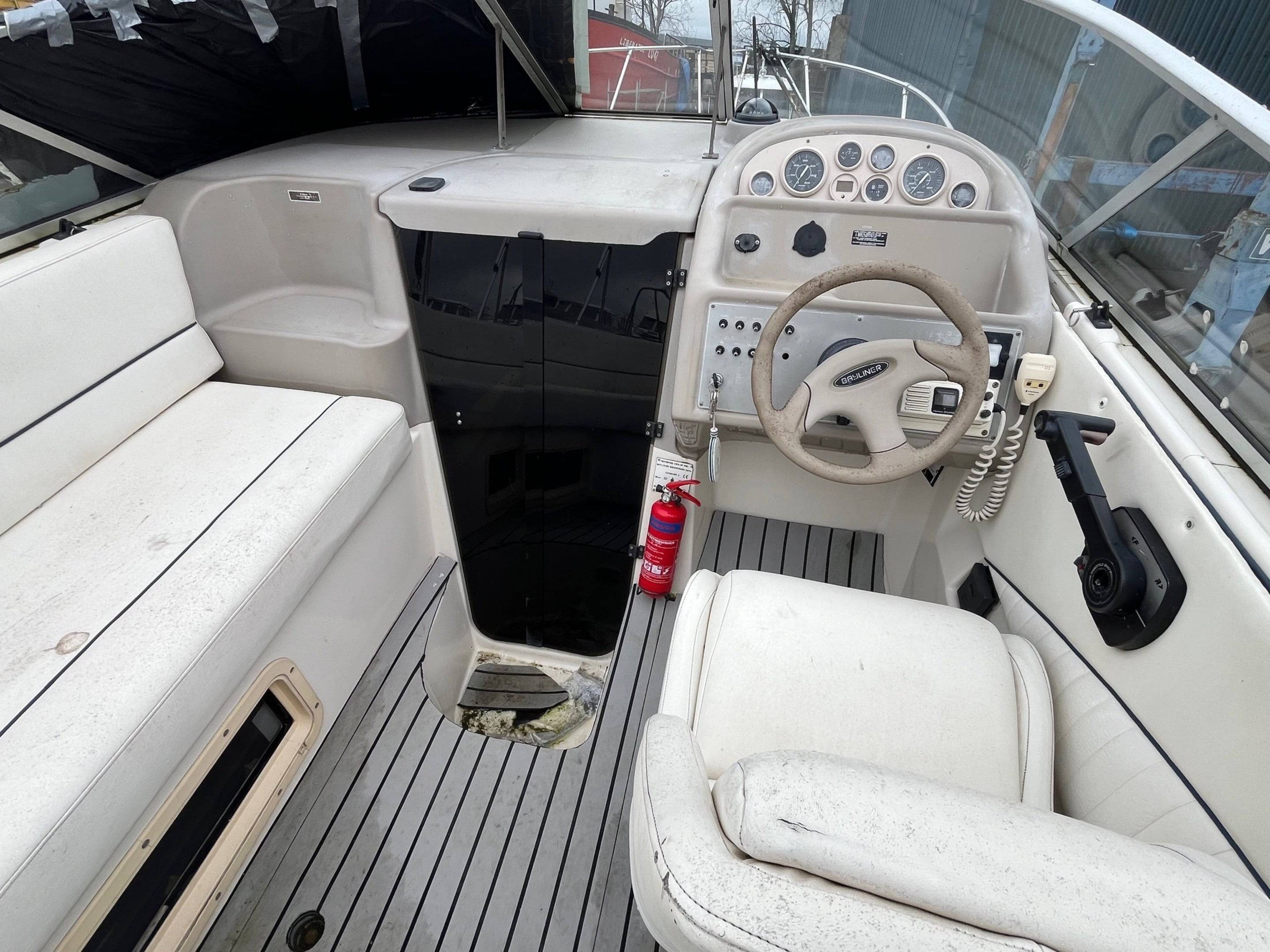 FOR SALE – PROJECT BOAT 1995 Bayliner Ciera 2655 – Mercruiser 5.7L Petrol engine and outdrive. This Bayliner Ciera 2655 is offered as a project vessel at a reduced price. The boat has sustained damage to the front windscreen and will require cosmetic tidying throughout. It is sold strictly as seen, with no warranty implied or given. All viewings are welcome. Please note: the boat must be removed from the marina, as we require the berth space. For more information or to arrange a viewing, contact: Boat Salvage UK 01702 258885 // www.boatsalvage.uk // Darren@boats.co.uk